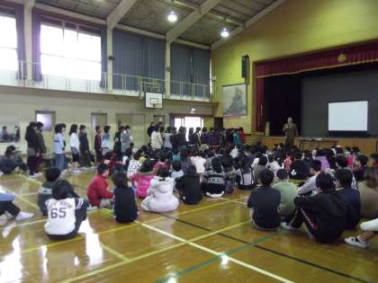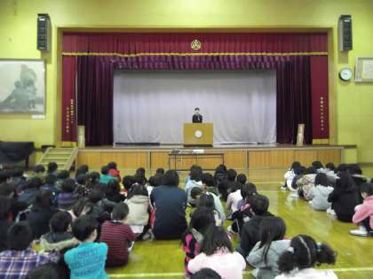 3月の朝会がありました。まず始めに,校長先生から,「山登り大会」での3年生の活躍の紹介がありました。「初めてのコースを,ひとグループもバラバラになることなく,しっかりまとめて楽しくできました。リーダーとしてよくがんばりました。」と,全校児童の前で褒めてもらって,笑顔いっぱいの3年生でした。