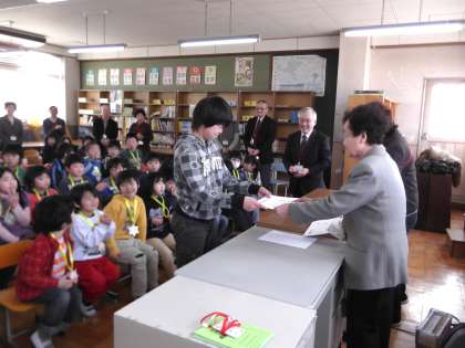 放課後まなび教室運営委員長のお話の後,1〜3年生にはメダルを,4〜6年生には修了証書が手渡されました。どの子も,「1年間がんばったよ。」という充実した様子で胸を張って受け取る姿が見られました。最後に,6年生が代表で,放課後まなび教室の先生方に感謝の言葉を言いました。放課後まなび教室で,地域の方々に支えられ,子どもたちの成長を大きく感じた一年でした。