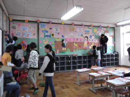 明日の入学式を前に,新6年生が入学式準備(掃除や飾りつけ)をしました。最高学年の自覚をもち,きびきびと行動し,短時間で体育館周りや廊下,教室がとても綺麗になりました。教室も新1年生が楽しい気持ちで入学して来られるようにとかわいく飾りつけをしてくれました。新2年生も,お迎えの言葉の練習を大きな声で頑張ってしていました。一つ学年が上がったという子ども達の活き活きとした笑顔で,明日,気持ちよく平成24年度のスタートがきれるという思いが胸の奥から湧いてきました。