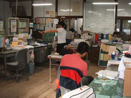 職員室では,新刊図書の整理をしたり,運動会でするダンスを選んだり,学芸会の脚本を検討したりしています。