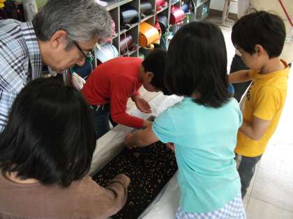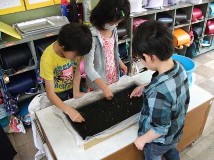 2年生が,「お米の学習」で種まきをしました。先日選んだよい種籾(もみ)を水につけておきました。連休の間に,種籾から芽がでてきました。お米マイスターの長谷川さんに苗床の作り方を教えていただき,芽が出た籾を子ども達が少しずつ蒔いていきました。土に根をはり,しっかりした苗に育ってほしいです。子ども達は,早く田植えがしたいようです。