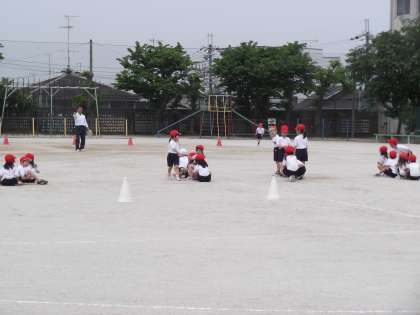 1年生が,体育で「リレーあそび」をしていました。一生懸命走る姿が,入学して1ヶ月ですが,もうすっかり小学生の姿になったように見えました。リレーは,タッチで交代して,子ども達の声援も聞こえ,盛り上がっていました。