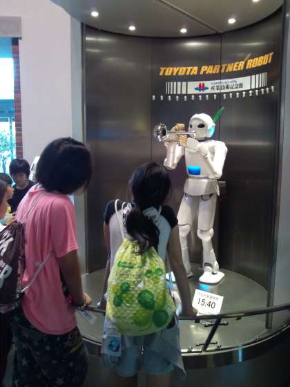 産業館では,様々な繊維の展示がしてありました。子ども達はいろいろな繊維があることに驚いていました。また,ロボットがトランペットの演奏をする展示では,1日に6回しか演奏がないのに,ちょうど見ることができました。「見ることができてラッキー!」ここでも笑顔いっぱいの子ども達でした。