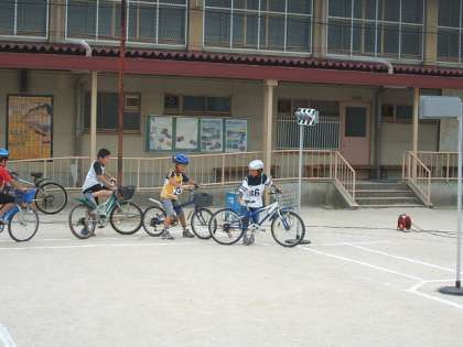 4年生は自転車免許教室をしました。東山署交通課の方に指導していただき,交対協・東山安全対策委員・自転車安全推進委員の皆さんにお手伝いしていただきました。