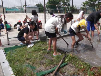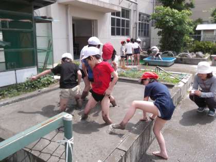 2年生はその後に田んぼにはいりました。ぬるぬるする田んぼを柔らかくしようと2年生も一生懸命足で土を踏んでいました。水と土が混ざった,よい田んぼができました。