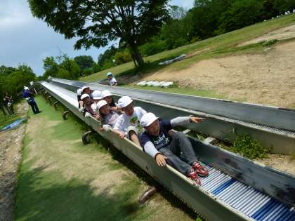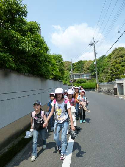 学校出発から3年生と5年生が合同のグループで,一緒に活動しました。電車の中では,5年生が3年生を気遣って席に座らせて,自分は立っているやさしい姿が見られました。鴻ノ巣山公園には大きな遊具があり,子ども達は大喜びでした。長い滑り台で何度も滑る子もいました。「電車のように連結して滑るとスピードがついておもしろい。」と,数人でつながって滑る姿も見られました。公園にはシロツメグサもたくさん咲いていて,草の飾りを作る子もいました。自然の中でおもいっきり遊んだ一日でした。
