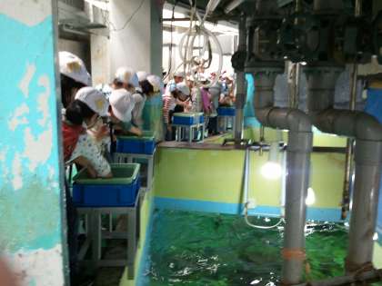 餌の与え方を教えてもらい、みんな大はしゃぎで餌をやっていました。また、魚の習性など興味深い話には、真剣な表情で聞いていました。