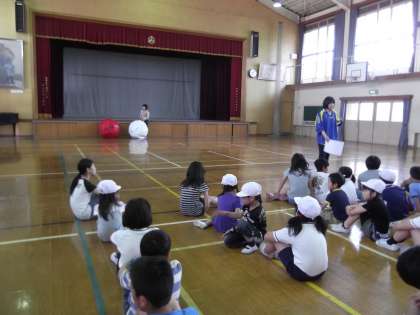 運動会のフレンドリー種目『大玉ころがし』の練習が,中間休みにありました。今日は入退場の練習が中心でした。子ども達は,空気が入って膨らんでいく大玉を早く触りたそうでした。次回は,大玉を使って練習する予定です。子ども達の気持ちも,運動会に向けて高まりをみせています。