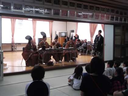 まず最初に,雅楽の曲を聞きました。その後,雅楽演奏の人達が,「どうしてその楽器をならすようになったのか。」「難しいことは何か。」など,3年生の子ども達の素朴な質問に,とてもやさしく答えてくださいました。「笛を吹くのに口にとても力がかかるので,顔の形が変わる人もいるよ。」ということを聞いて,子どもたちはびっくりしていました。