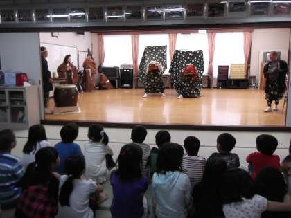 次に,獅子舞を見せてもらいました。獅子舞が終わると,中に入っておられる方が息を切らせながらも,笑顔で出てこられたのが子ども達にはとても印象的だったようです。一生懸命舞ってられること,みんなのためにさせていることなどを,子ども達は肌で感じたようです。教室にかえってからも話が尽きませんでした。