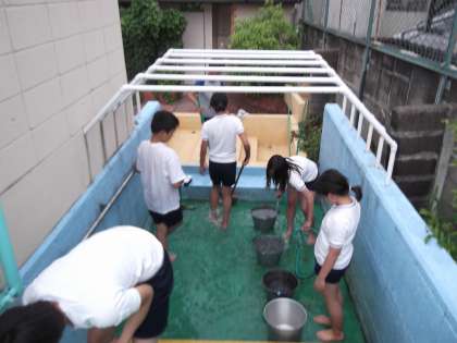 6年生がプール掃除をしました。まずはプールサイドやシャワー場,腰洗い槽をしました。デッキブラシやたわしでごしごしこすって,とても綺麗になりました。「もう中に入っていい?」と,どろどろの水のなかに入っていって,プールの壁面も一生懸命こすってくれました。