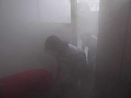 その後,東山消防署泉涌寺出張所から消防所員の方に来ていただき,煙体験をしました。訓練用で無害,少し甘い香りのする煙をランチルーム中に焚いて,全校の子ども達が順にその中を通り抜けました。初めて煙体験をした子も多く,「前が見えなかった。」「少しドキドキしたけれど,外に出られてよかった。」「アイスのにおいがした。」等々,少し興奮気味でした。消防署の方が,「本当はもっと違う臭いがして,息ができなくなります。吸わないようにしましょう。煙は上の方に行くのでできるだ身をかがめ,下の方を煙をかき混ぜずに壁などを伝って進み,できるだけ早く外へ出ることが自分の身を守ることです。」と,煙の中での避難の仕方を教えてくださいました。
