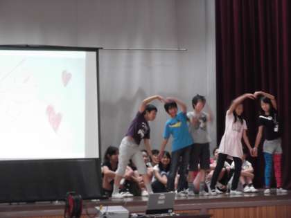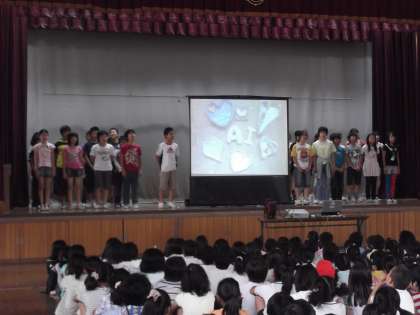 6年生は,バザーのお店紹介をしました。今年のお店の名前は『愛』です。「心を込めて作る」「買って下さる方へ,愛をこめて」という気持ちでこの名前にしたそうです。つかみは漫才風に,次はお店の名前の理由をゼスチャーを入れて,そして商品の宣伝,最後にアピールの歌もあり楽しくお店をピーアールしていました。