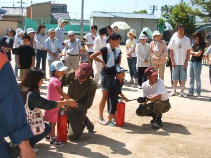 9時30分に今熊野小学校グランドに各町内から訓練で避難してきました。各種団体・来賓のあいさつの後,起震車による地震体験や消火器による消化訓練が行われました。消防団による消化訓練のデモンストレーションも行われました。