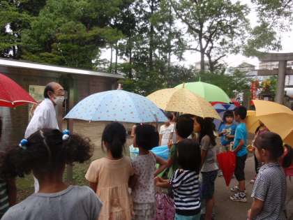 少し雨が降っていましたが,総合で地域のことを学習している3年生は,新熊野神社の宮司さんにお話を聞きに行きました。なぜ「新」なのか?,大きな樟に住むという「トトロ」の声が聞こえるか?,子どもの獅子は男の子?...など,秘密をいっぱい聞かせていただいた子どもたちは目を輝かせていました。