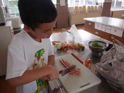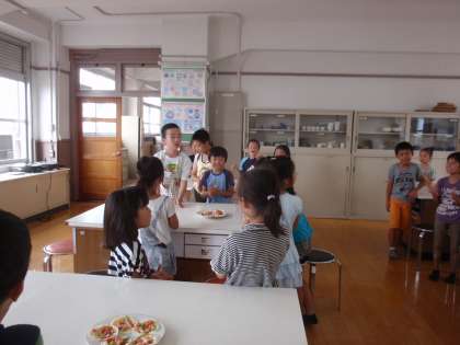 お誕生日と畑の収穫をお祝いして,そしていつもいっしょに学習をしたり遊んだりする3年1組のみんなに感謝の気持ちを込めてピザパーティーをしました。畑でとれたピーマンやトマトで作るピザは特別おいしかったです。