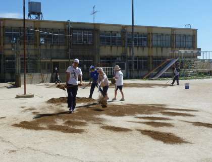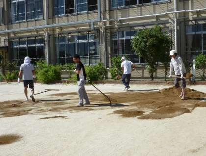 今年は,理科室やゆうゆうル—ムの整備をしました。運動場の土入れもしました。炎天下の中,土を入れ踏み固めました。
