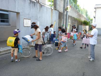 夏休みが終わり,子ども達の登校再開にあわせて,PTA地域委員の方々が,東西両門に立って子どもたちを出迎えてくださいました。お道具箱や夏休みの工作など,大きな荷物を抱え,子どもたちが元気にあいさつしながら登校して来きました。