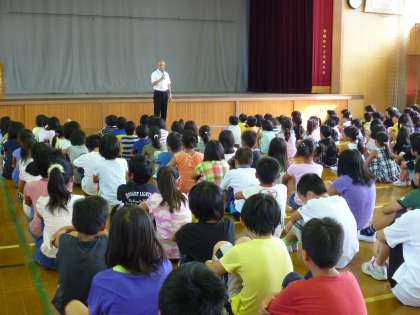 学校長が,「オリンピックの選手のインタビューで『みんなに支えてもらって感謝している。』という言葉がほとんどの選手から聞かれました。日々すごい努力をしている選手たちが,自分の努力のことより感謝の気持ちを表していることに感動しました。みんなも周りの人に支えられていることを考え,感謝の気持ちを持って日々を過ごしましょう。」と話されました。どの学年の子ども達も,とても真剣に話を聞いていました。その姿に,子ども達の大きな成長を感じた朝会でした。