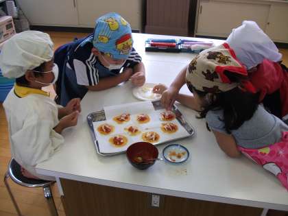 2年生が生活科で育てたトマトが,夏休みの間にたくさん収穫できました。収穫に感謝をして,トマトパーティーをしました。冷凍保存しておいたトマトの実を,鍋にかけて温めながらつぶし,餃子の皮の上に置き,ピザ風に仕上げました。自分たちが育てたトマトはとっても美味しく,トマト嫌いの子も「美味しかった。」と,パクパクっと食べていました。