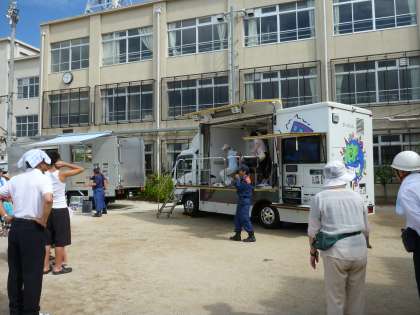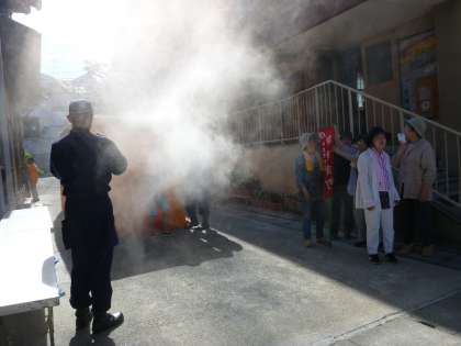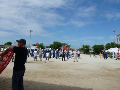 9月2日(日),本日8時45分に大きな地震が発生したという想定で,今熊野学区総合防災訓練が行なわれています。各地区ごとに集合した人達が学校に避難してきました。入口に置かれた煙体験ブースを通って運動場に到着し,ケガや家屋被害状況を報告しました。その後,起震車体験やバケツリレーによる消火活動,ケガ等の救急救助練習,体育館での避難時の注意などを知るコーナーを順に回って,緊急時の対応の仕方を学んでいます。大きな災害が起こらないことを祈りながらも,『備えあれば憂いなし』,万事に備えて訓練されています。
