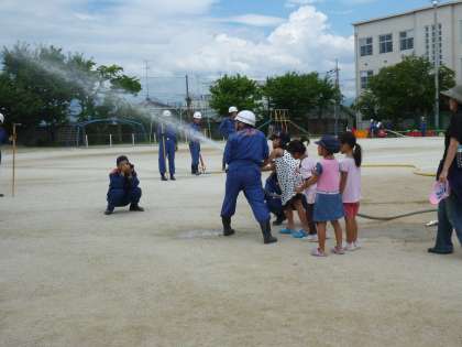 今熊野学区総合防災訓練の最後に,今熊野消防団による放水訓練がありました。消防団の方々は,日々今熊野地域の防災のために活動されています。南校舎に向け勢いよく放水されると拍手が起こっていました。その後放水体験もあり,経験した人から「水の勢いが強かった。」と感想が聞かれました。