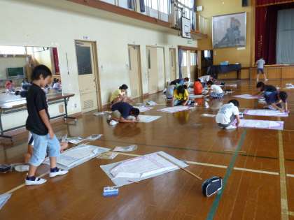 エプロン生地に型紙をのせてまち針で止め,チャコペンでしるしを付けるところは,布を大きく広げてできるようにと,体育館でしました。どの子も,体全体を使って布を押さえて線が曲がらないようにと,少し緊張した表情で印をつけていました。