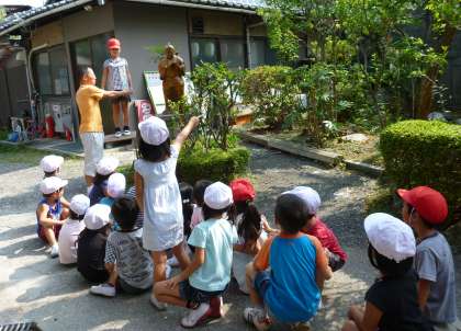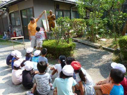1年生が,算数「おおきさくらべ」の学習で,職員室前の二宮金次郎像と自分たちとどちらが大きいかを比べていました。まずは台の上に乗って「○○さんの方が大きい。」との声。「全員台の上に乗ることはできないね。どうしたら比べられるかな。」との問いかけに,「何か当ててみたら。」との意見が出ました。長い筒を二宮金次郎像当ててみるとほぼ同じ大きさで,その筒を一人ずつ自分に合わせていきました。「やっぱりぼくの方がおおきい。」と予想が当たって嬉しそうでした。