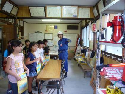 また,消防分団の方に教わって,放水訓練もしました。代表者が放水すると周りから歓声があがっていました。「消防団の返事は,ハイとは言いません。ハイは燃える灰につながるので言わないのです。よし!と言います。」と教えてもらい,どの子も大きく元気に「よし!」と返事をし,きびきびと動いていました。