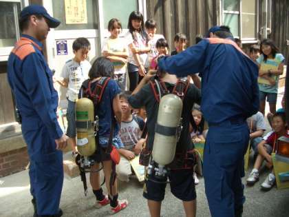 今日は,今熊野消防団の方と東山消防署泉涌寺出張所の方に来ていただいて,仕事(活動)のことや消火・避難のことなどを教えていただきました。そして,校内にある消防分団室の中や運動場地下にある防火水槽,消防自動車などを見せていただきました。いろいろな道具やその使い方,消防分団の方や消防士さんの思いなど,子ども達は一生懸命メモを取ってしっかり学習していました。
