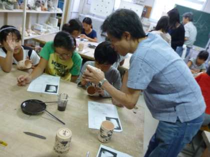 まず始めに,事前に描いた自分の下絵を見ながら,素焼きのコップに鉛筆で下絵を描いていきました。途中で,指導の陶芸家の方からアドバイスをもらいながら,一生懸命絵を描いていました。「上手に描けたね。」と褒めてもらうと,とても嬉しそうでした。