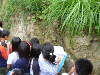 今熊野地域にも,天然記念物に指定されている「東山洪積世植物遺体包含層」という地層が見られる場所があります。地層があるお宅にお願いし,実際に地層を見学させていただきました。その地層が何からできているのか,なぜそこに見ることができるのかなどを話し合いました。「積って山になった。」「海の底が山になったから。」等々の意見が出,これから調べていくことになりました。