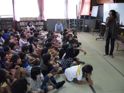 大石先生が「今年も今熊野小学校で,みんなに逢えてよかった,よかった。』と身ぶりを加えて言われると,低学年の子ども達は,そのしぐさにノリノリになりました。その後,『よかったね ネットくん』のお話を読んでいただき,「なんちゅうこっちゃ。」「よかった,よかった。」という言葉が出てくるたびに,体全身で動作をし,お話に引き込まれて楽しんでいました。