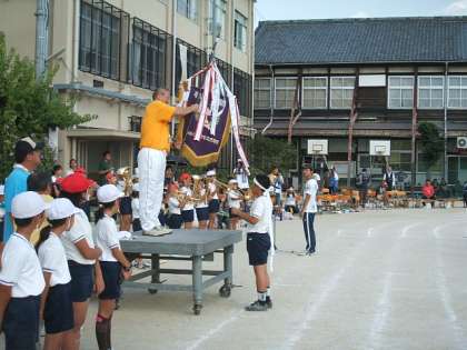 一日中晴天で暑い中がんばった子ども達。勝ったチームも負けたチームも大きな拍手をして最後までしっかりとお話を聞いて閉会式を終えました。