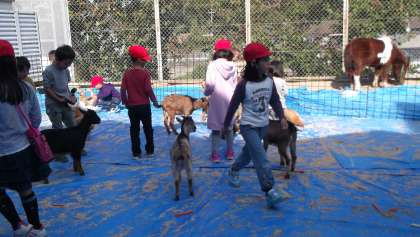 移動動物園には,ヤギやポニー,ウサギ,ヒヨコ,カメやヘビ等々,いろいろな動物がいました。子ども達は,餌を持って柵の中に入り,とっても嬉しそうにお目当ての動物にあげていました。ヒヨコをだっこをしたり,ウサギをなでたりもしました。また,ヘビを首にネックレスのようにかけてもらい,ご満悦という顔をしている子もいました。
