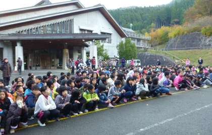 「山の家」2日目は,朝の集いで学校紹介がありました。今回は,桂坂小学校・花園小学校・修学院第二小学校と,東山南三校が野外活動に来ていて,それぞれの学校の特色が聞かれました。「山の家」の玄関前が子ども達でいっぱいになりました。