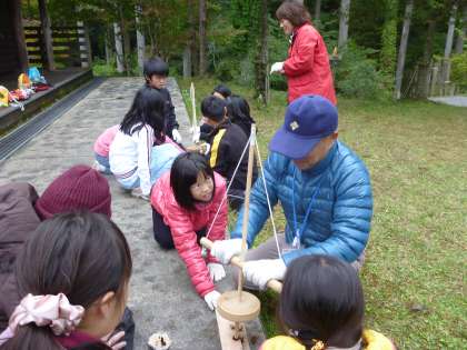 朝からの活動で子ども達は,「山の家」の自然観察と火おこしを,三校合同班で行いました。自然観察では,所員の方から植物についていろいろな話を聞き,実際に草花を手に取り,とてもよい学習ができました。火おこしでは,なかなか火がつかず,グループのみんなで自然と協力する姿が見られました。現在の便利な生活を少し見直す良い機会になりました。