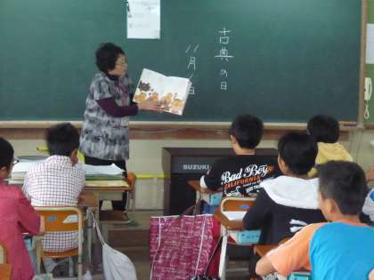 11月1日は「古典の日」です。「古典の日」にちなんで,6年生の今日の「朝の読み聞かせ」は,古典落語「まんじゅうこわい」でした。