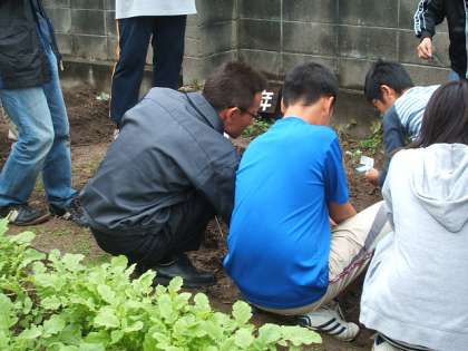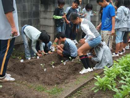 物事のすべては等価交換の原理です。何もないところから植物は育ちません。土の中に育つだけの養分が必要なのです。土作りの大切さ,虫や鳥から作物をどのようにして守るかなどを学んだ後,定植作業をしました。