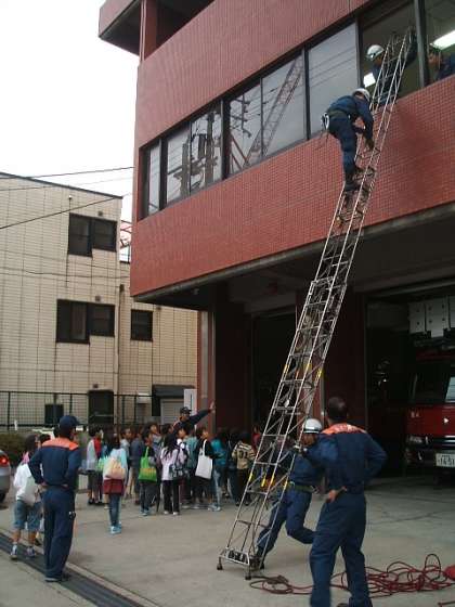 その後,はしごを使った救助訓練を見せていただき,消防車,救急車を間近で見ながら説明を聞きました。そして,消防隊員の方が実際に火事場で身につけておられる防火服を着させてもらいました。