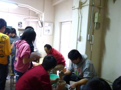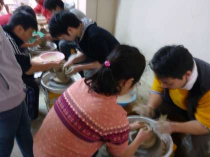 その後,一人一人匠についていただき,粘土こねから始めました。粘土こねも見た目ほど簡単ではなく,粘土がなかなか上に上がってきませんでした。「はじめから上手にいくはずがないよ。」「そこまでできたら上等。」などと励まされ,匠に手を添えてもらいながら,子ども達は,どうにか粘土をこね,自分の作りたい茶碗の形を作ることができました。