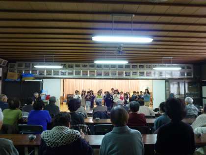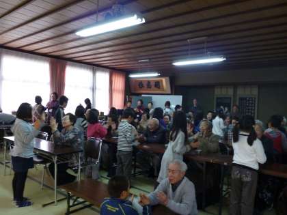 3年生は,まず始めに,歌紹介で2部合唱のところをアピールしてから,『小さな世界』という歌を歌いました。とても上手に合唱していて大きな拍手をしていただきました。音楽の後,おじいちゃんおばあちゃん達のそばに行って,今熊野の良さを話してもらいました。そして,茶つみの歌に合わせて,手合わせ遊びを一緒にしました。おしゃべりも手合わせ遊びも,とても楽しかったです。最後に『ゆうやけこやけ』の歌を歌うと,会場からも一緒に歌う姿が見られ,子どもたちとおじいちゃんおばあちゃんとの交流の深まりを感じました。