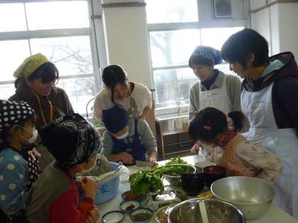 1月11日(金),2年生の学年親睦会がありました。2年生が自分たちで育てたお米と大根とネギを使って,親子でおにぎりとお味噌汁を作りました。