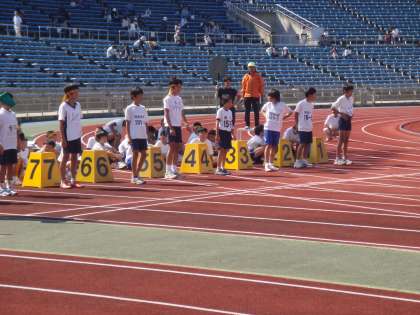 連休の最終日10月12日(月)に京都市小学生陸上記録会が西京極陸上競技場で行われ,6年生12名が参加しました。