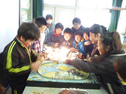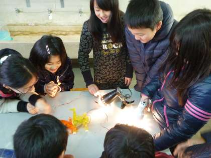 この日は少し曇っていたので,理科室で太陽光に見立てた電気を使って,太陽電池を使っての実験をしました。光の当て方でプロペラやおもちゃの動きが変わるので,子ども達はいろいろ当て方を工夫して楽しんで実験をしていました。太陽電池を使ったクイズ形式の学びもあり,とても楽しんで学習を進めていました。