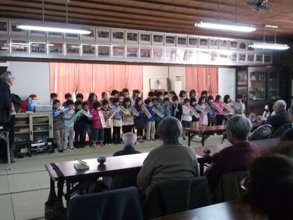 1年生は,まず始めに季節の歌『春よこい』と『早春賦』を歌いました。「難しい曲なのに上手に歌っているね。」という声が聞かれました。次に鍵盤ハーモニカで『かっこう』の曲を吹き,最後に『ひな祭り』の歌を歌いました。一緒に口ずさんでおられる方もありました。1年生の可愛さに,会場の方たちも終始笑顔いっぱいでした。お手伝いをされている方も,1年生が退場する時一人一人に握手をしてくださっていました。
