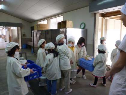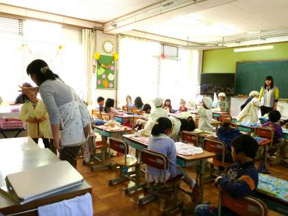 先週金曜日に給食が始まり,今日は2回目の給食です。1年生が,机の上の準備の仕方や,給食当番の仕方を一つずつ確認しながら給食準備を進めていました。当番の子はとてもしっかり活動することができていました。