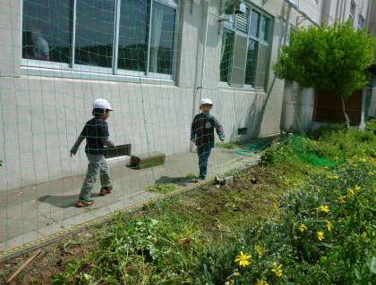 運動横の花壇に,琉球朝顔(オーシャンブルー)の芽が出てきました。今年も緑のカーテンの設置時期になり,北校舎の南壁にカーテン用のネットをおろしました。1年生がそばに来て,「先生何しているの。」とかわいく聞いてくれました。夏になってしっかりつるを伸ばし,大きく立派に花をつけ,子どもたちを驚かせてくれることを期待して,ネットをしっかり張りました。