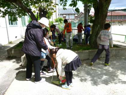 今日は,まず顔合わせをして,「くすの木」共同作業所のことを聞きました。その後,一緒に掃除をしました。少しの時間でしたが,力を合わせると周りがとても綺麗になっていきました。「こんなにきれいになるなら毎日きてほしいな。」という子どもの言葉に「私たちも仕事をしているので毎日は来られないんだよ。」と話されました。