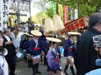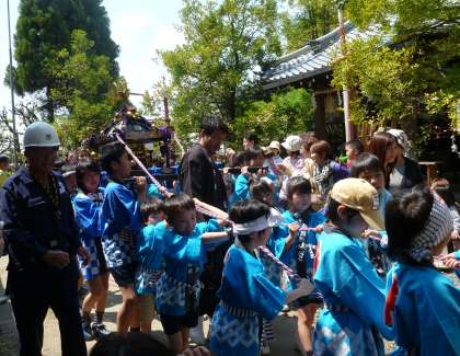 朝夕は少しひんやりしていましたが,晴天の祭り日和,神社の周りには露店が並び,たくさんの人でにぎわっていました。